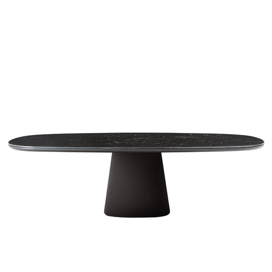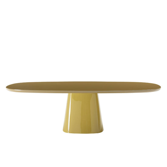 The finishes underscore the sophisticated elegance of the inspiring concept behind it. These pieces are available in glossy and matte painted finishes in many colours, and also in light and black oak wood. The top and base can also be finished in combinations of different colours. Furthermore, the table can be enhanced with an upper marble top or with sophisticated glossy black glass.