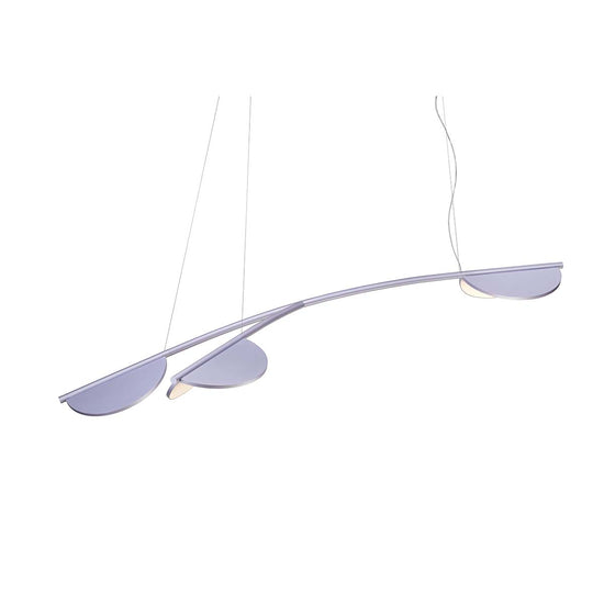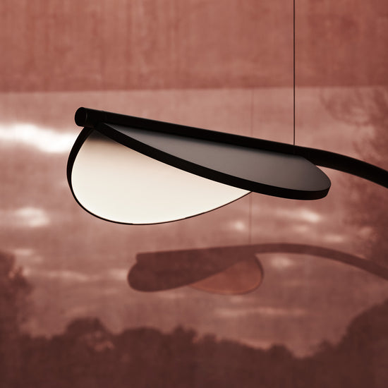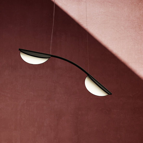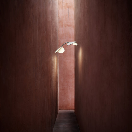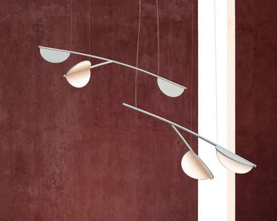 Its shape resembles that of two shells of an open almond, connected by a central pin, from which, thanks to a LED source, the light is diffused and comes out evenly occupying the entire open surface. The module, assembled on a linear or curved shaft, can be set to obtain a series of solutions with 3, 4 or 6 lights, which can be positioned downwards or upwards.