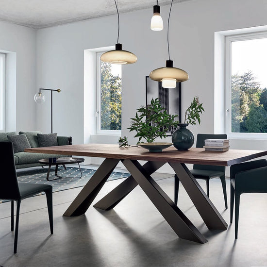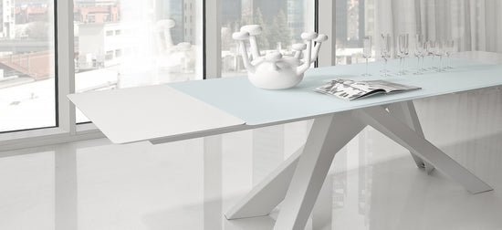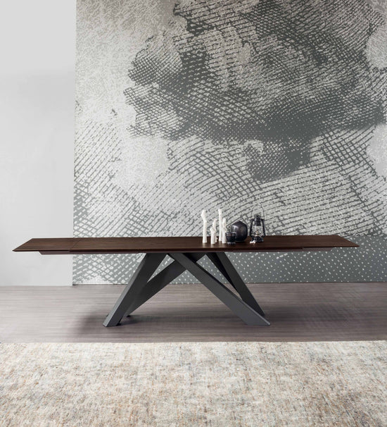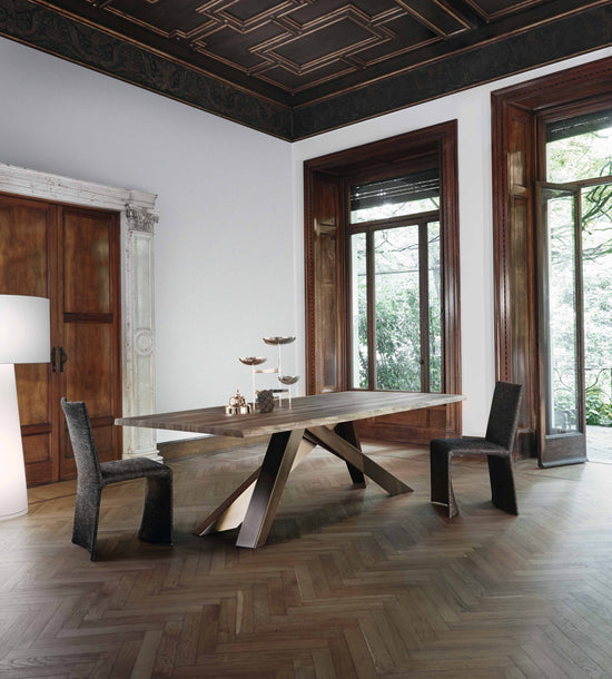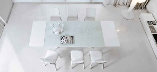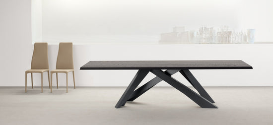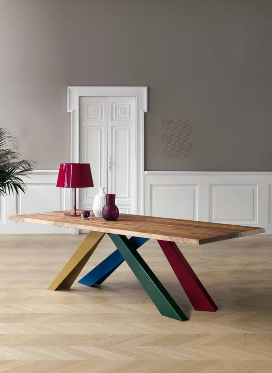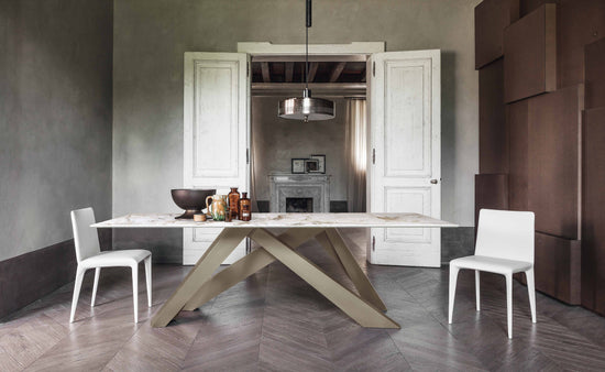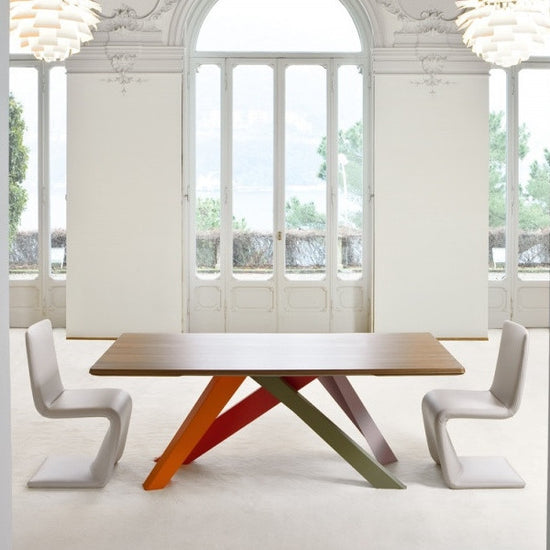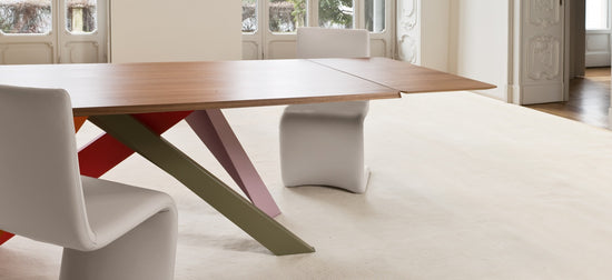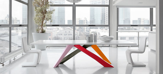 The inclination of the legs suggests dynamism, the linearity of the top gives great visual stability. Still, or in motion, Big Table has a decidedly out of the ordinary personality. The legs of Big Table are in laser-cut steel in different sizes and geometric shapes, contoured and matt painted in numerous colour combinations; the top, fixed or extendable, is available in matt white lacquer or in various wood, crystal, clay and ceramic finishes. Plastic, sculptural, a sure protagonist in traditional or more contemporary contexts thanks to the countless customization possibilities, Big Table has become the icon of the Bonaldo style. For this reason, to celebrate the 10th anniversary of the launch of the Big Table, a Special Edition in Saint Denis marble was created in 2019.
