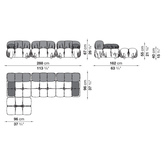 The fundamental characteristic of Camaleonda is its unlimited modularity, a geometric nature that allows each element to become a sort of enormous pixel through which to define your home environment. Thanks to the tie-rods and rings, the modules can be unhooked and recombined at will, allowing the sofa to adapt to an evolving taste and to the dynamic needs of those using it, while always maintaining its unique identity.
