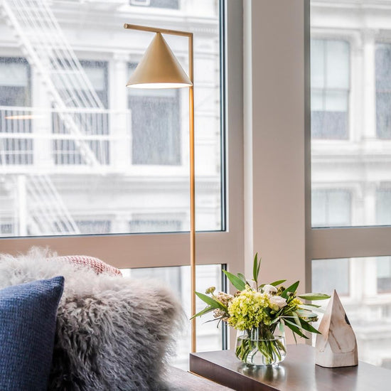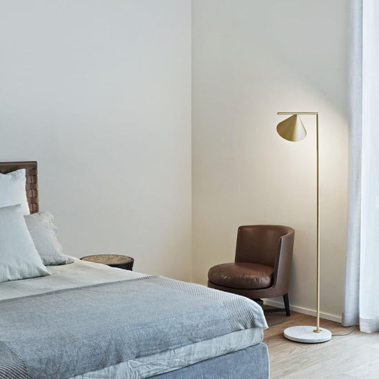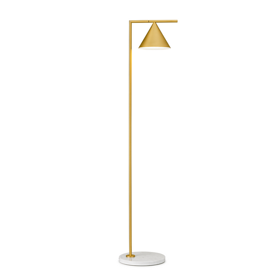 Sleek and graceful, this versatile floor lamp features smart details from head to toe.  At the top, its spinning cone diffuser provides direct light that can be repositioned. On the bottom, it is weighted by a stunning white Carrara or black Marquina marble base. Its stem and cone are available in painted steel or brushed brass.