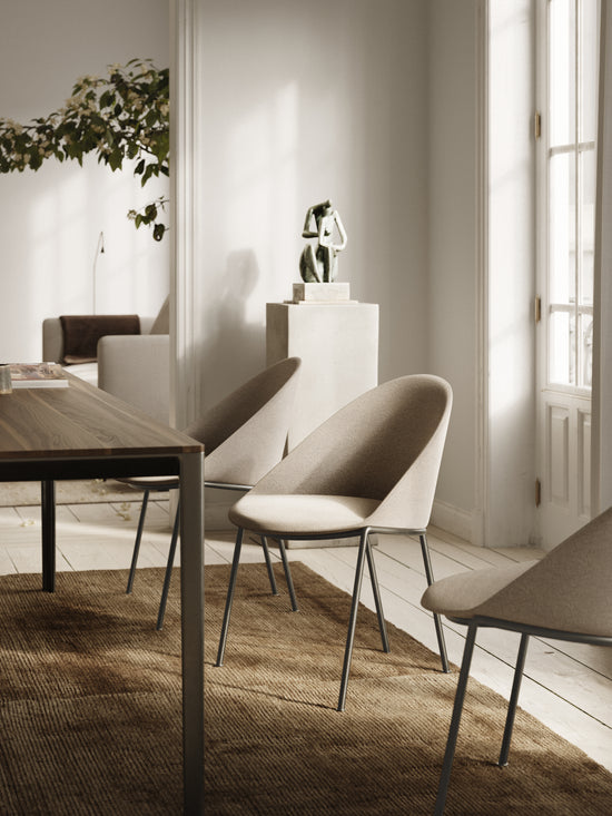Simple curves compose the backrest perimeter and waterfall front edge of the Circa dining chair. Finely crafted upholstery augments the graceful form with a tailored appearance.