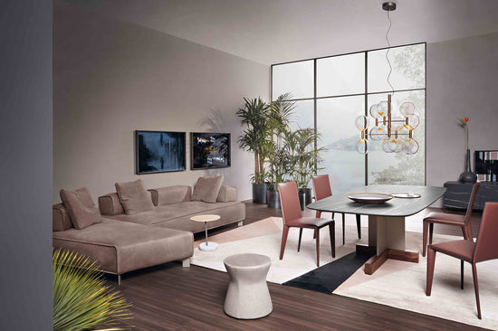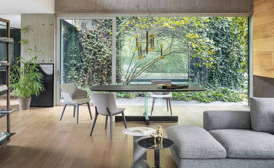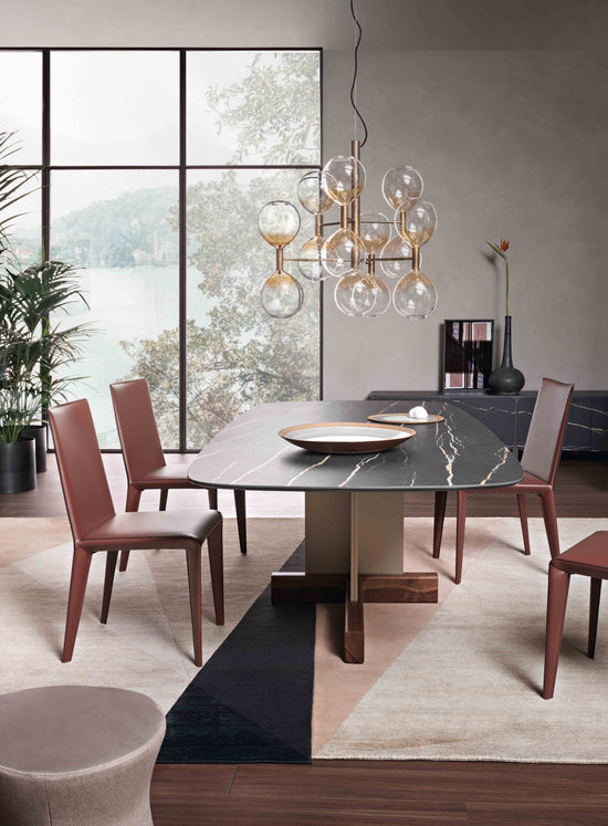 “Cross Table” is the synthesis of the cross combination of three essential elements (top, metal structure and base) that, in a refined combination, offer an evocative scenic effect.