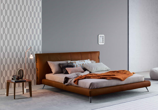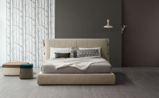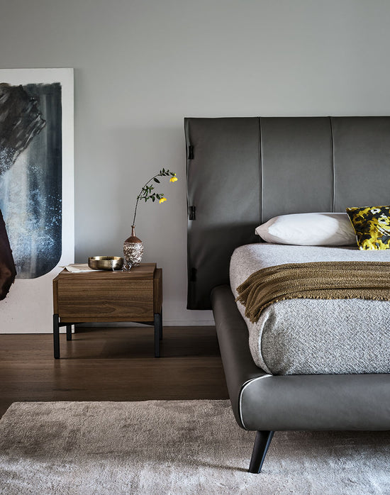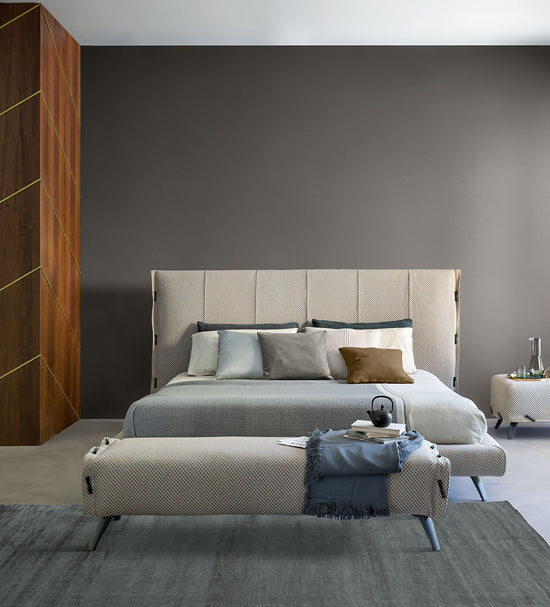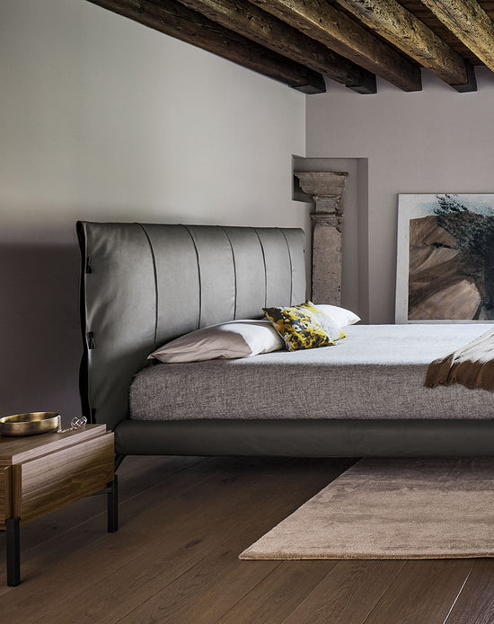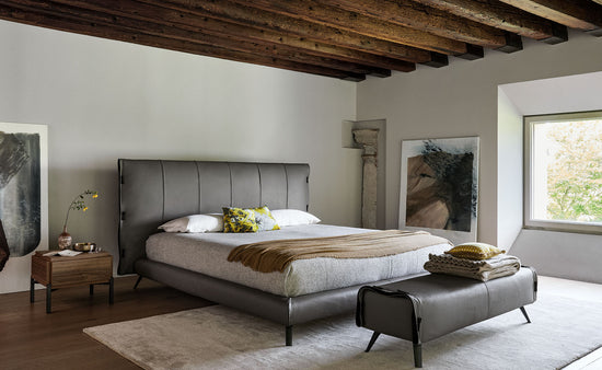 The upholstery of the Cuff headboard can come with leather, eco-leather or fabric covers, with visible leather inserts both on the headboard and on the bed surround, while the feet are made of painted metal, in a host of different colours. Cuff is also available in the storage version (Cuff open), double-movement mechanism version (Cuff easy open) or high headboard (Cuff hi). A coordinated bench and a pouf can be matched to the bed.