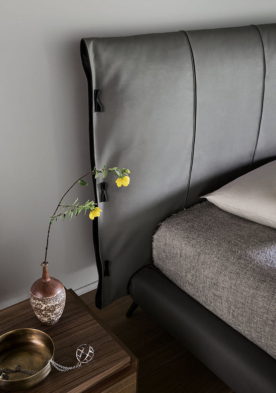 The Cuff bed expresses its strong personality in the tailoring details: from the frog fastenings that adorn the two flaps which cover the padded headboard, to the pleating that marks the vertical pattern of the back panel cover.