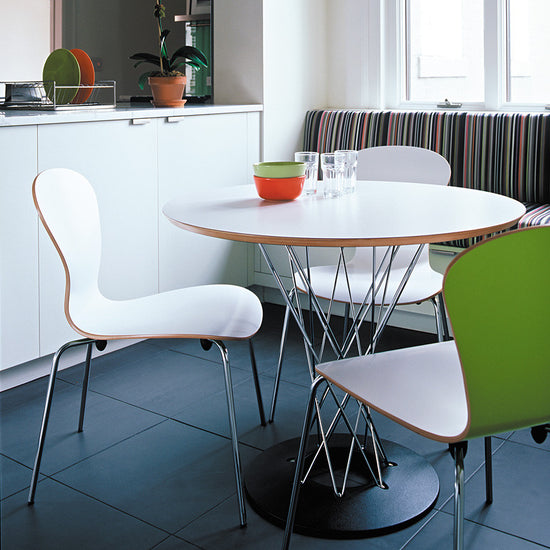 Initially conceived as a rocking stool, Isamu Noguchi's playful design caught the attention of Hans Knoll who thought it a perfect complement to the Bertoia wire collection. At the suggestion of Hans Knoll, Noguchi adapted the stool into a small table in 1954, and a full size dining table in 1957. The signature base features chrome-plated steel wires set into a cast-iron, black porcelain-finished foot.