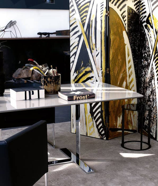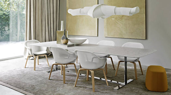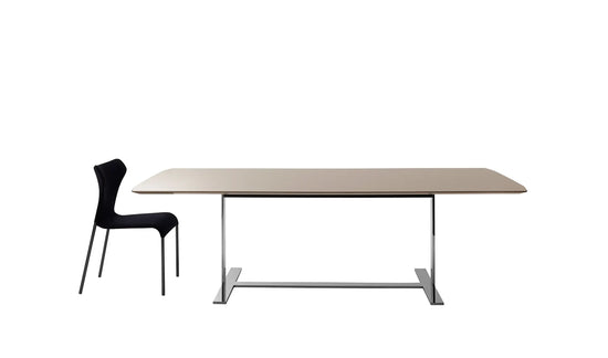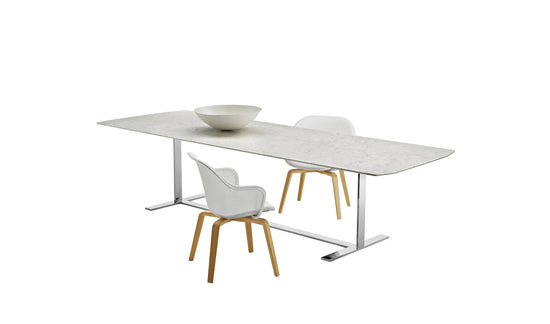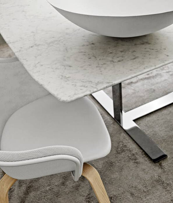 The Eileen tables are classics today with their versatile features, the elegance of the rounded top and the strong profile of the base with its cross-shaped motif. They are the expression of refined aesthetics that combine well with other products.