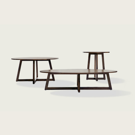 Finn is a solid wood table with angled frame-style legs. The intersection at the base anchors the design to the floor and contrasts with the visual lightness of the tabletop. A great design to pair with clean-lined contemporary upholstery and modern classic styles.