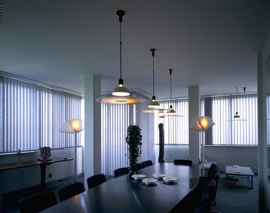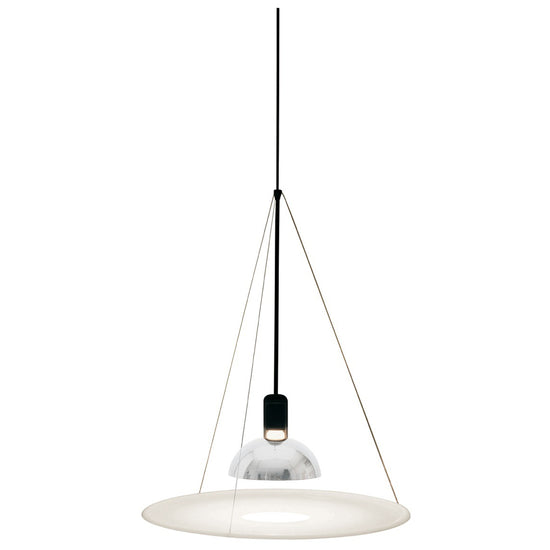 Its name invokes the iconic toy best played in a park, but this light is seriously smart. Offering three types of illumination—diffused, direct, and reflected—the 1978 Frisbi creation doubles down designed Achille Castiglioni’s ability to play with the power of illusion. Three barely-there, fine steel cables suspend the opal acrylic diffuser, making it appear as it if it is floating. A black metal stem and wire mesh basket assembly secure the reflector to its power cord.