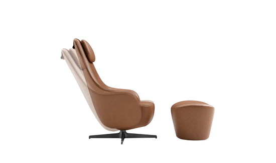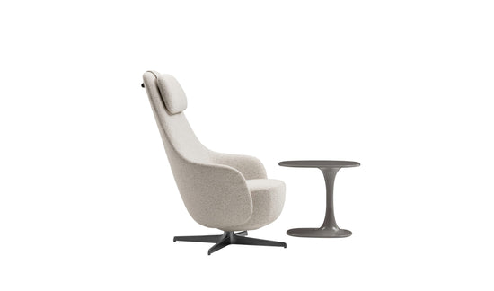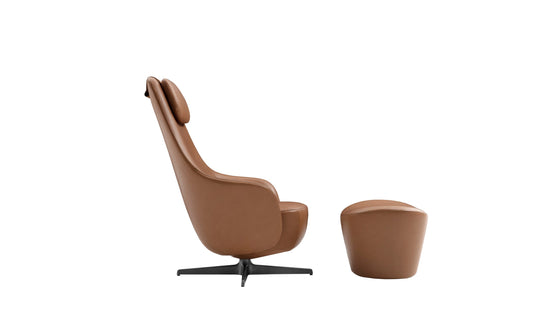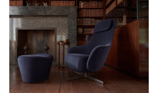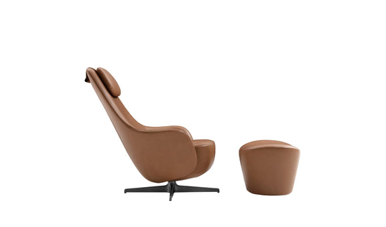 To control the movement, all you have to do is operate a lever strategically placed between the cushion and the armrest: once you have reached the most comfortable position, you release the lever and the backrest stops at the desired angle. To increase the feeling of well-being, the seat accompanies the backrest and moves almost unnoticeably. Harbor Laidback also features a height-adjustable upholstered headrest, distinguished by its distinctive counterweight, and can be combined with a cosy matching footrest and a round ottoman with removable wood tray.