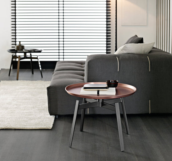 Designed to accompany the Husk bed, it is useful in domestic environments with its design based on a circular metal tray lightly resting on solid die-cast supports. Painted in three colours, the top also has a copper finish as homage to an ancient material that was once associated with classical aesthetics, and which has been revisited today with modern sensitivity.