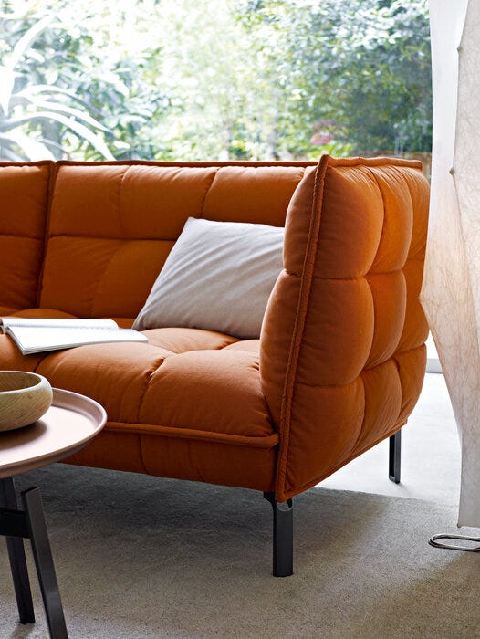Warm and comfortable, Husk-Sofa is born from the overturning of the traditional construction process of a sofa: it is in fact its soft and flexible parts that have structural qualities. It has a deep seat and comes in two sizes. Its important volume is made lighter by the supports available in different finishes, while the loose down cushions increase its comfort. Refined and informal at the same time, Husk-Sofa revisits the tradition of Chesterfield sofas and addresses the theme of capitonné quilting in a contemporary version.