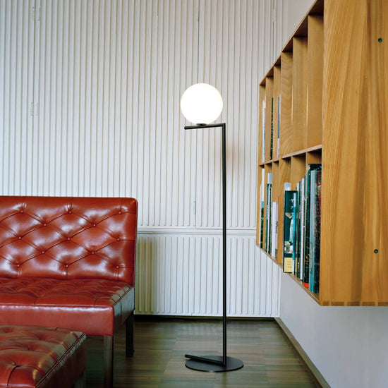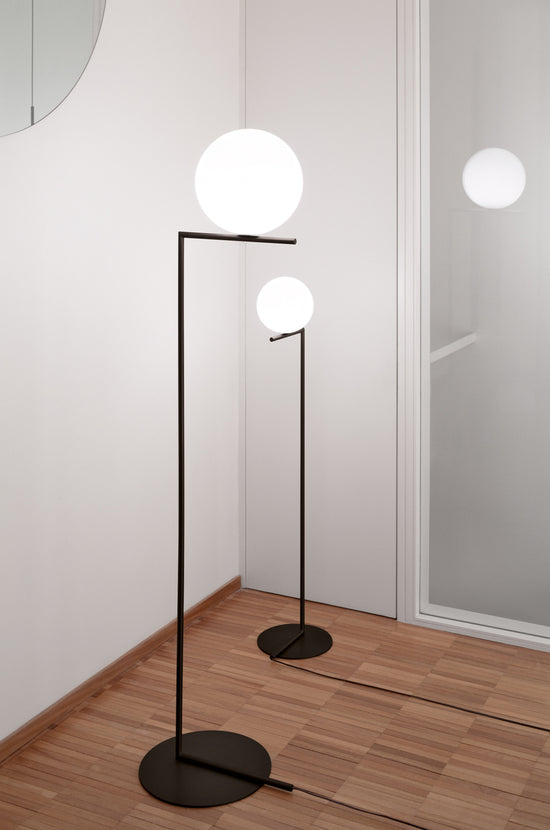 IC Lights F consists of a thin steel frame that bends at a 90-degree angle. From there, a blown-glass opaline orb delicately balances. The floor lamp, which casts diffused light, can be adjusted by a dimmer on the power chord. IC Lights F is now available in a brand-new black finish that adds dimension to the stunning collection of deceptively simple designs.