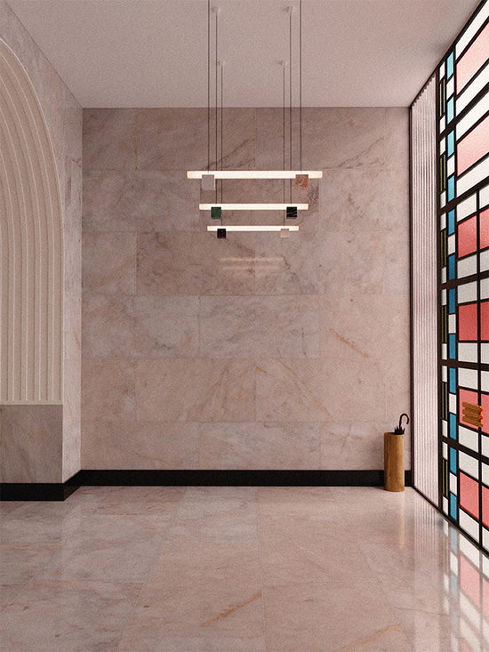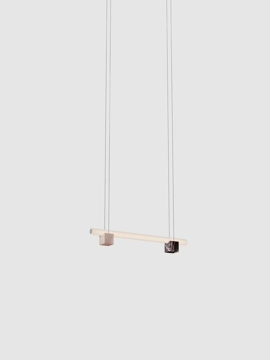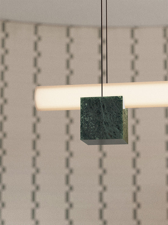 An ode to quiet strength, Isle is a play both on illusion and perception allowing lightness to anchor and foundations to rise. Composed of a delicate glass tube resting on solid-stone and aluminum pedestals and suspended in mid-air like a surreal bridge, Isle is minimal, but never simplistic.