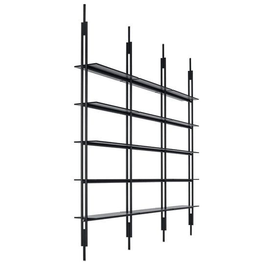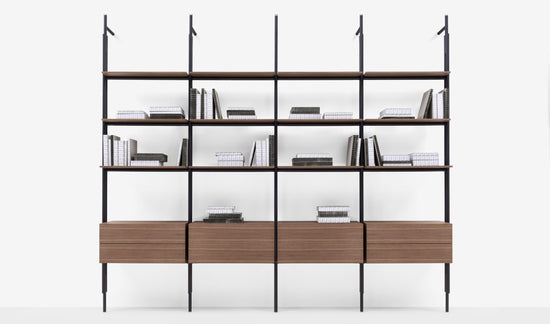 Classic yet contemporary, essential yet extremely flexible, the Jack wall system is offered in two versions: with vertical floor to ceiling uprights, or with rods to be fixed to the wall. The modularity and discrete technical solutions underlying the project make it possible to create compositions for every room and furnishing context.