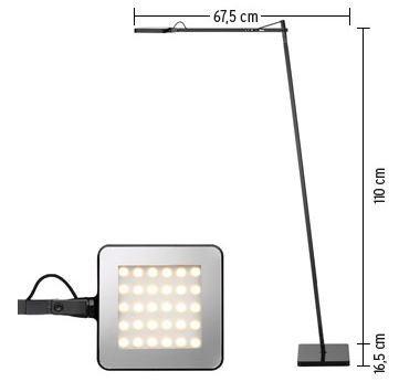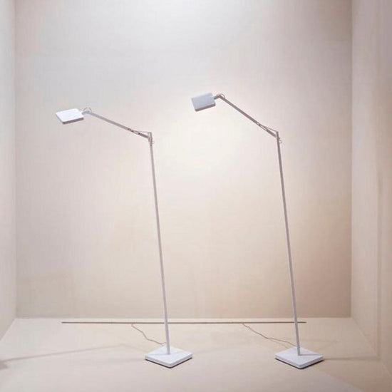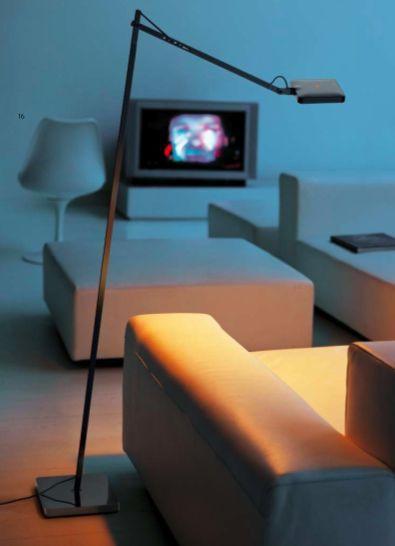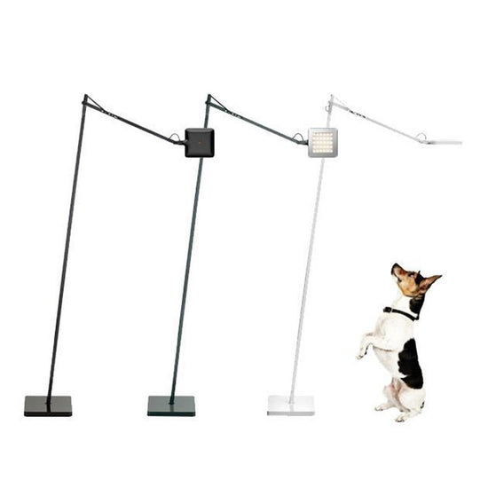 Part of the popular Kelvin LED family, the Kelvin LED F floor lamp features the collection’s signature square head and utilizes the latest technology to provide precise customization of output. The three-step on/off switch utilizes Soft Touch technology, and the base cover is injection-printed PC (polycarbonate). The head is directional, the counterweight is an iron cut painted through a process of cataphoresis. The base separates from the lamp body, held in place with a safety-locking pin.