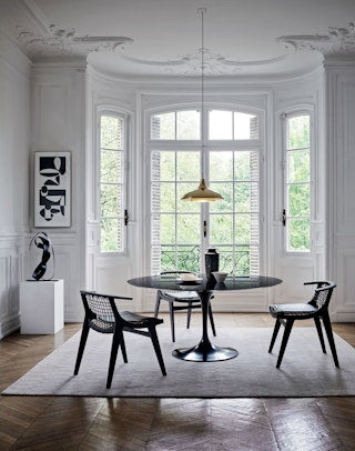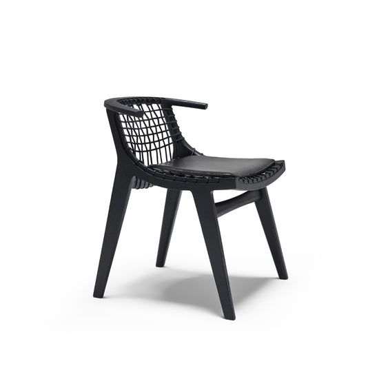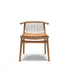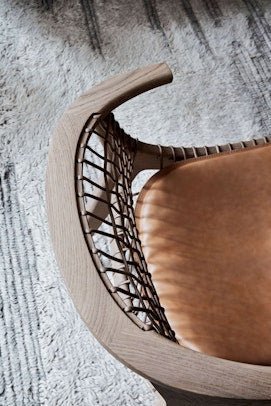 Expertly crafted from natural materials, the graceful form of the Klismos Dining Armchair welcomes the sitter with a scooped seat, precisely angled back, and wraparound armrests.