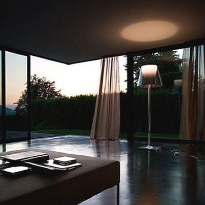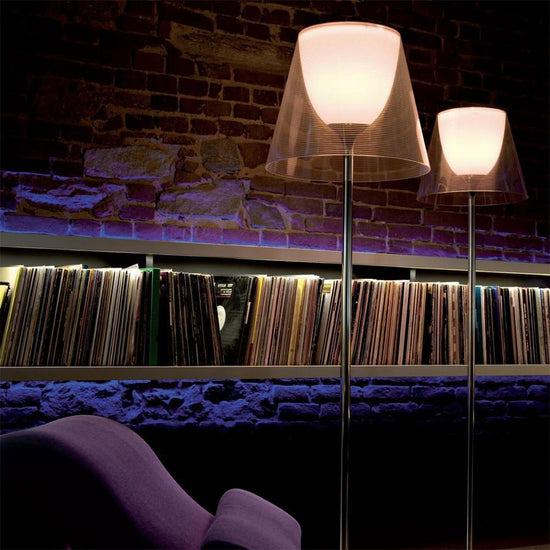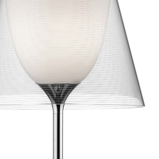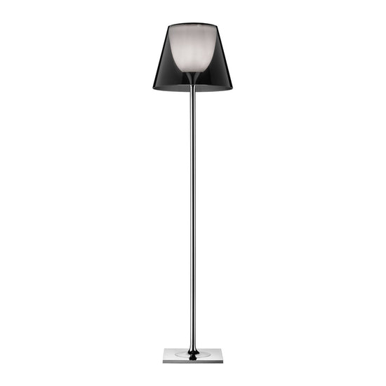 Subtle yet striking, the KTribe floor lamp by Philippe Starck provides diffused light through a transparent diffuser that gracefully moves the eye upward. The base, rod support, and diffuser support are die-cast, polished, and chrome-plated Zamak alloy. The rod is polished aluminum. The opal inner diffuser and support for the lamp holder are injection-molded PC (polycarbonate). Outer diffusers are transparent PMMA (Polymethyl methacrylate), available in silver or bronze. The upper ring is injection-molded PC, and is completely transparent (or transparent brown for the outer bronze diffuser).