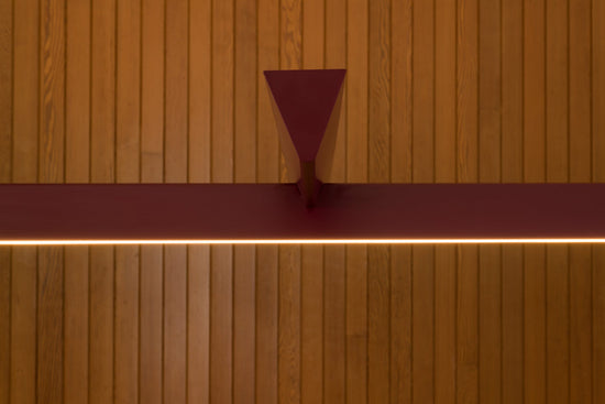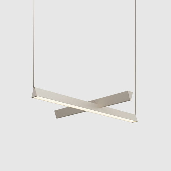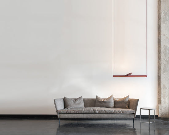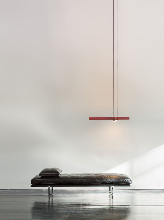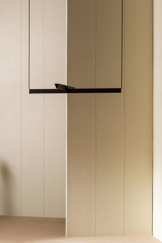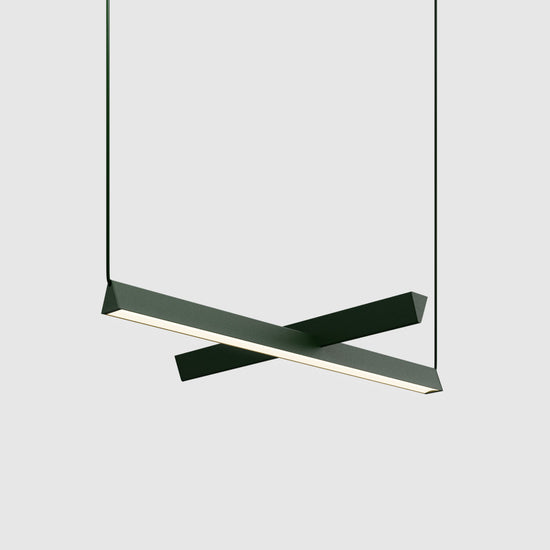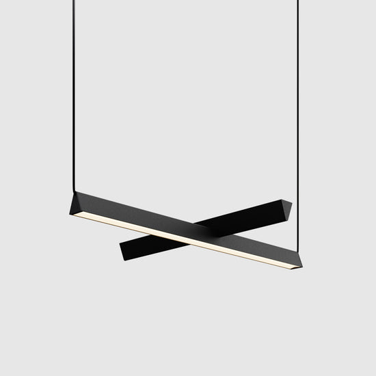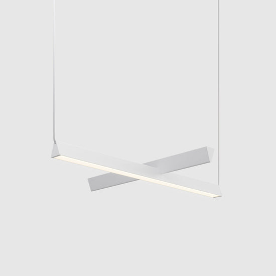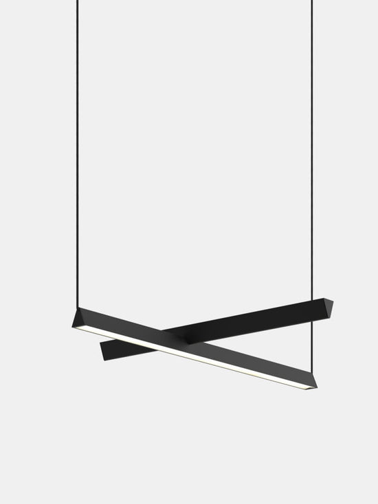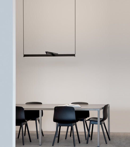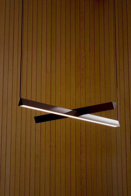 The Mile Collection offers a variation on the linear suspension—pared down to its asymmetrical expression— with two lines floating in surprising equilibrium. A play on contrasts, the 90° pivot marks out space with direct and indirect LED light.