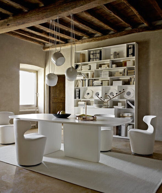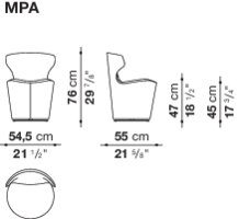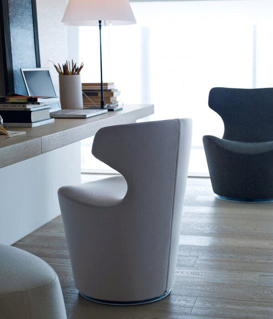 Upholstered either in fabric or leather and suited to both residential and public spaces, Mini Papilio echoes the characteristics of the iconic Grande Papilio armchair, only on a smaller scale. The playful design features a swivel base allowing 360 degree rotation with automatic return to the pre-set position. The image is that of a chair that welcomes you gracefully – with the graceful movement of a butterfly, or “papilio” in Latin. Fluidly designed around an upside-down truncated cone, the welcoming and sinuous shape of the seat and back ensures utmost comfort to the user. The wings that extend beyond the sides of the chair emphasise the feeling of comfort by supporting the hips and back.