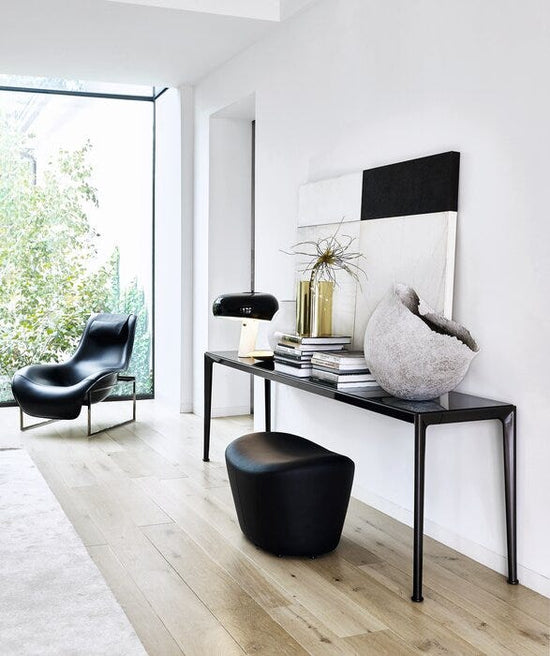 The console of the Mirto Indoor series stands out for its austere design, reduced thicknesses, precise details and a wide range of materials and finishes. The tops come in several versions: glass, marble, different coloured woods that match the painted die-cast aluminium frame.