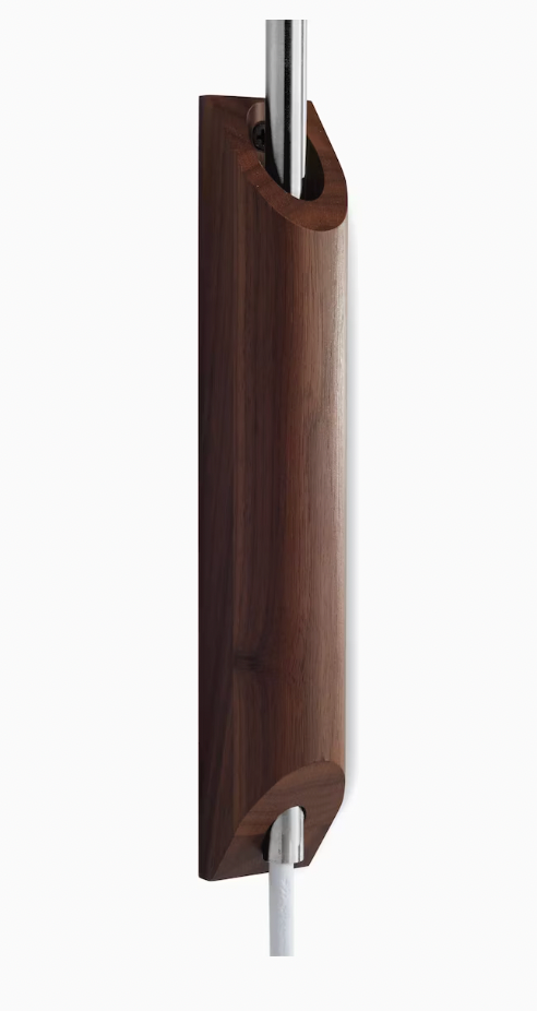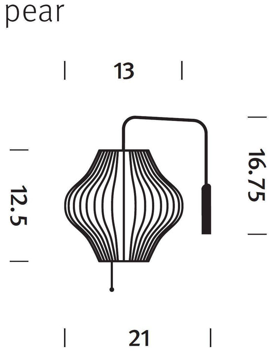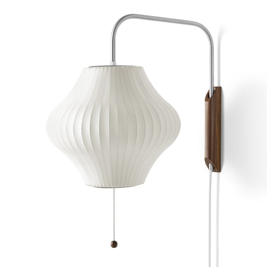The Nelson Pear Wall Sconce features a 2-inch-thick, solid walnut wall-mount, a steel arm that extends out, and a 12-foot plug-in cord. A swivel hinge in the arm allows for easy height adjustments.