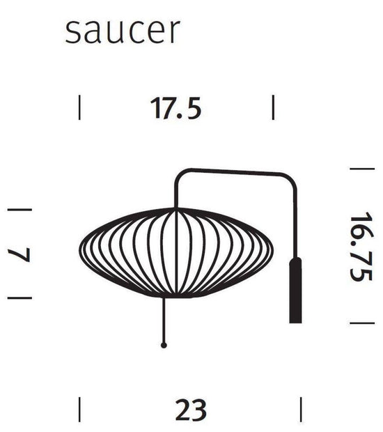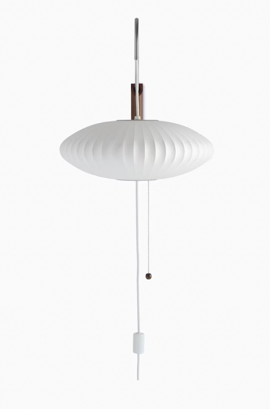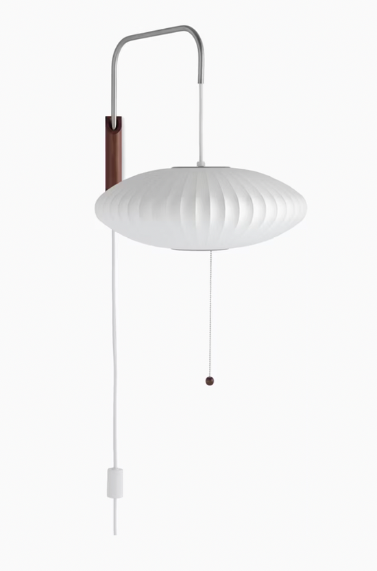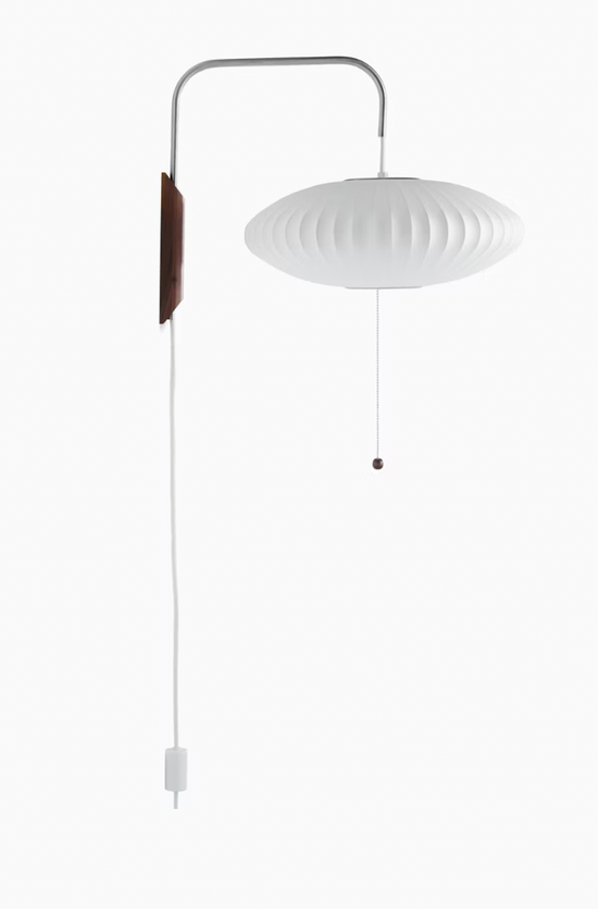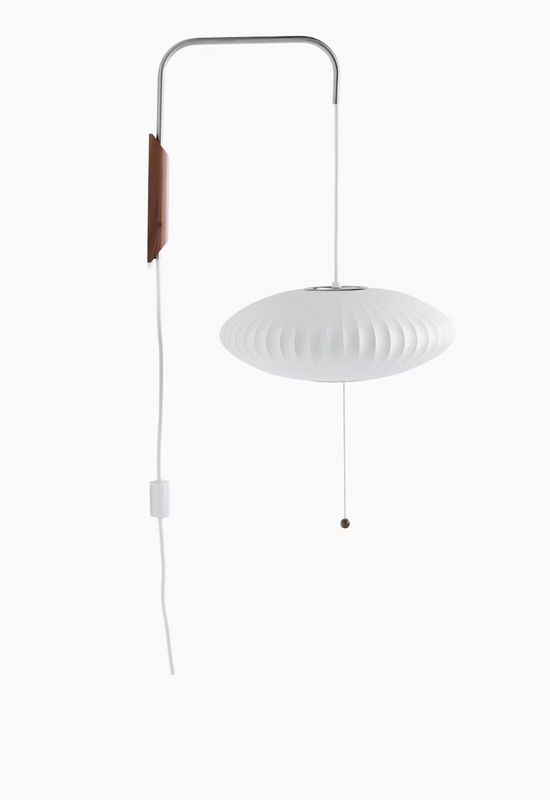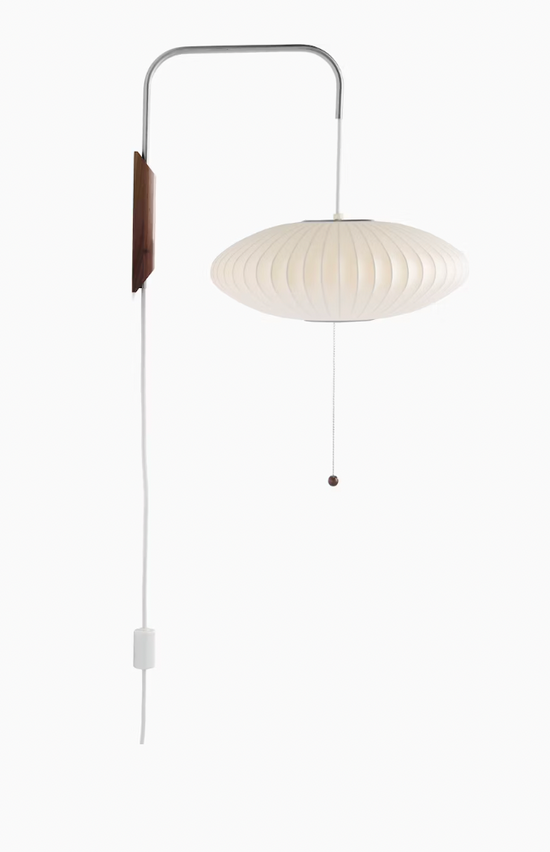 The Nelson Saucer Wall Sconce comes with a solid walnut wall-mount and a steel arm, and 12-foot plug-in cord. Its design allows one to adjust the sconce from left to right, and up and down, without needing to reposition it on the wall.