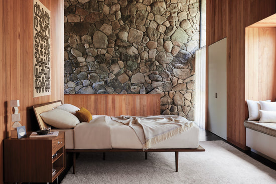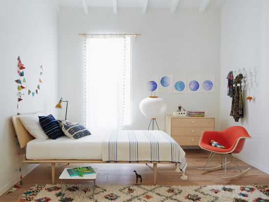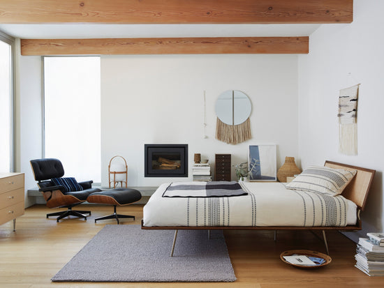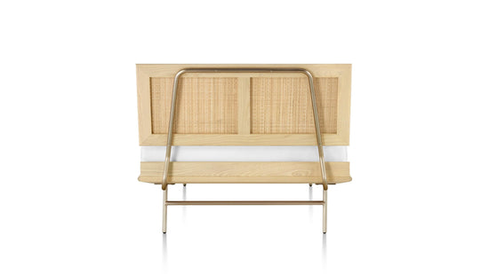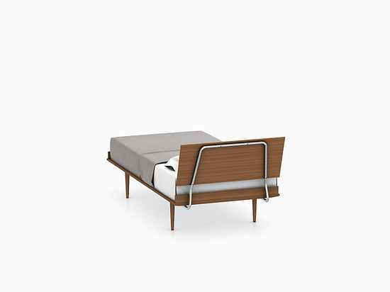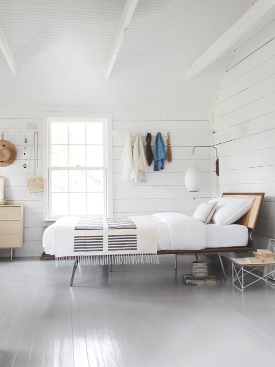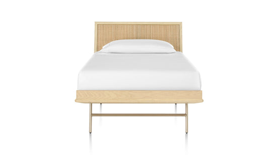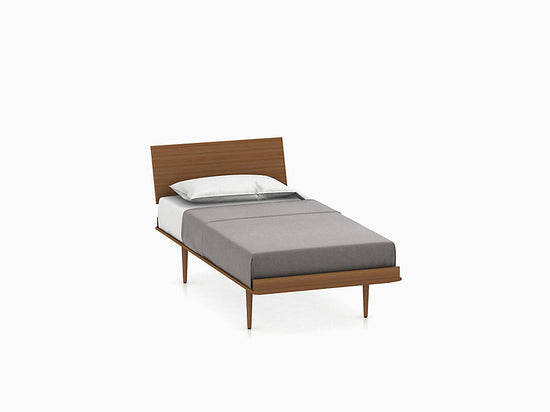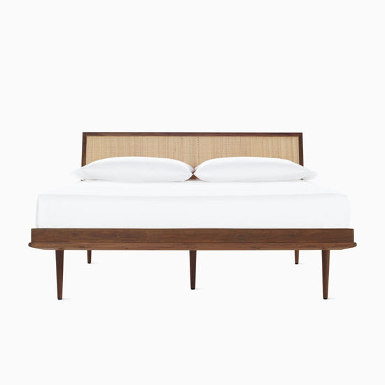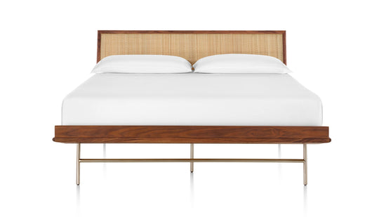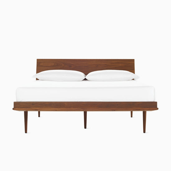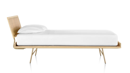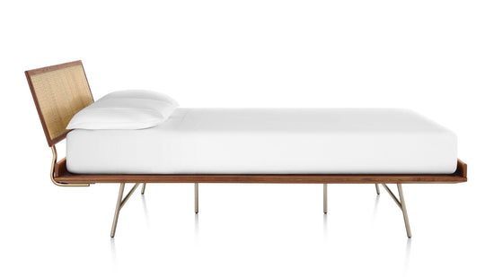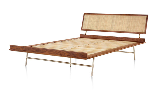 Keeping with George Nelson's vision of pieces that could be adapted for the times, the Nelson Thin Edge Bed (1954) now features slats instead of springs to accommodate memory foam mattresses. Finishes, including walnut and white ash, reflect new technologies and consumer preferences. The headboard is available with or without woven cane; legs may be solid wood or stainless steel. But even with these updates, this unmistakably remains a Nelson bed frame in its simplicity and quiet beauty.