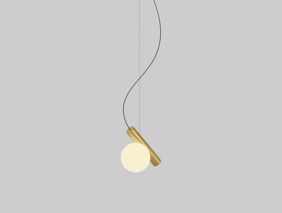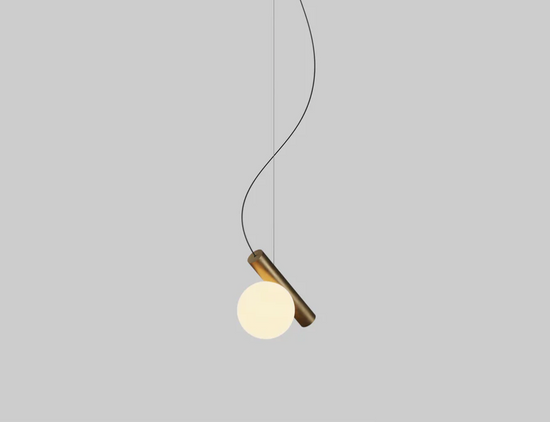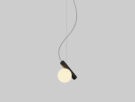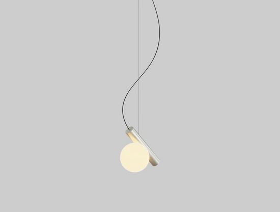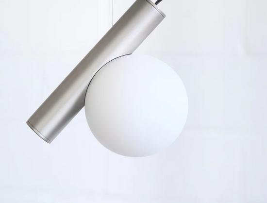 The Node Light uses the language of circles to present a delicate imbalance. A glass sphere traces its perimeter through a steel cylinder, attached at the source of light: an LED, the node. The material contrasts of weight and opacity add to the imbalancing act.