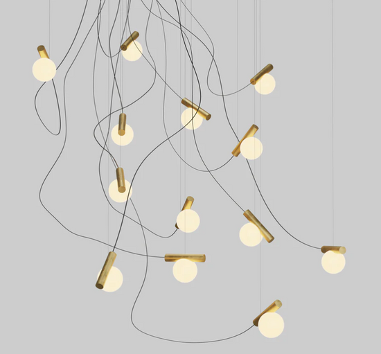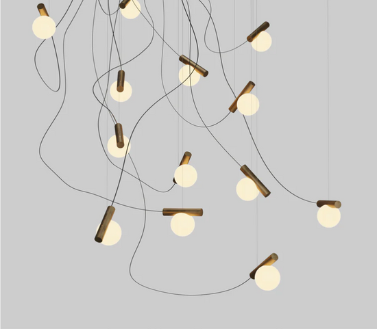 The Node Light uses the language of circles to present a delicate imbalance. A glass sphere traces its perimeter through a steel cylinder, attached at the source of light: an LED, the node. The material contrasts of weight and opacity add to the imbalancing act.