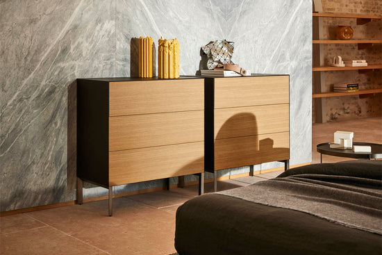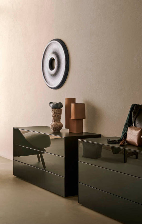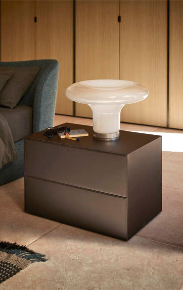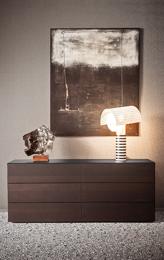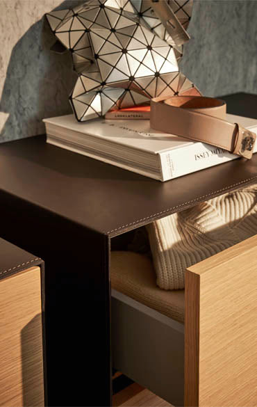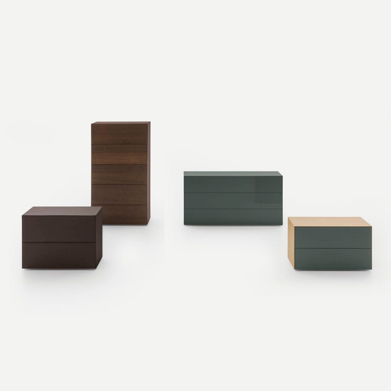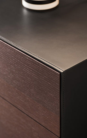 A clean yet elegant design with thin, continuous lines. Minimal and sleek, this collection of casegoods stands out for its flowing surfaces: a thin panel wraps around and conceals the entire structure, creating a unique, clean and delicate profile. Minimal in every detail, it features push-pull opening for the large, functional drawers. The base is optional, and available in three different heights. There is a wide choice of finishes for the cover, to meet every style and taste.