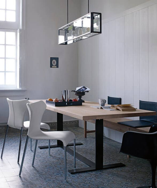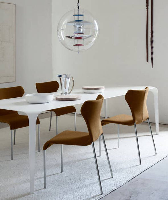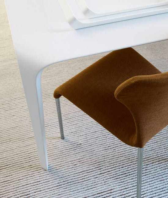 A chair and stool in two heights, Papilio can be used in formal contexts, while also allowing for a more informal use by leaning on one of the back’s “wings”, inspired by those of a butterfly (or “Papilio” in Latin). The formal balance derives from the constant thickness of the shell and from the shape of the seat, which is sinuous in the upper part and then merges with the light steel frame. Upholstered in either leather or fabric, Papilio’s cover can be removed using a metal zipper on the back, a functional and decorative detail that characterises the entire line of chairs of the same name.