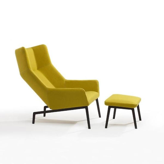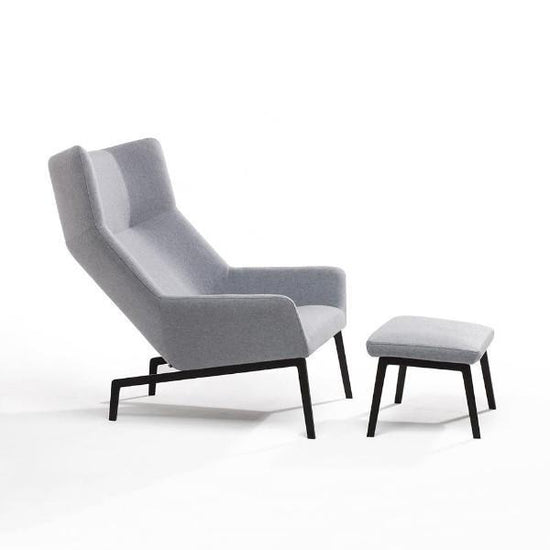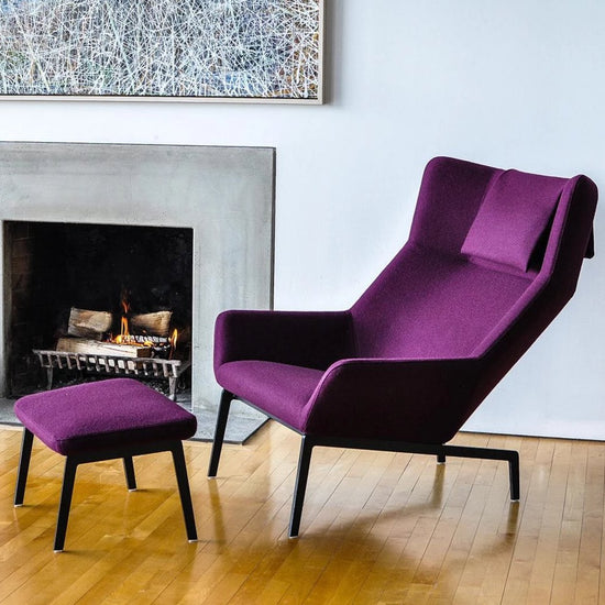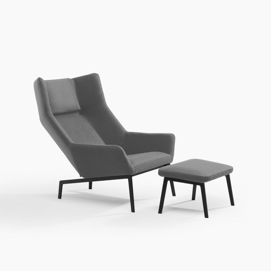 Combined with carefully selected foam densities and dimensions, this creates a contemporary chair that is superbly comfortable without the bulk of traditional padding. The upholstered seat sits on a simple precision-made steel base. Expertly sewn and fitted covers create a beautifully tailored appearance. A matching Ottoman compliments the aesthetic of the chair.