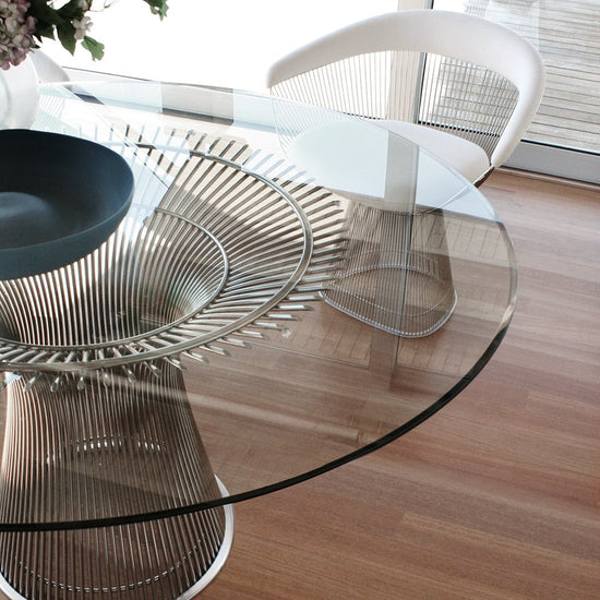 In 1966, the Platner Collection captured the “decorative, gentle, graceful” shapes that were beginning to infiltrate the modern vocabulary. The iconic dining table, which creates a focal point for any dining room, is created by welding curved steel rods to circular frames, simultaneously serving as structure and ornament. 70" table seats 8-9.
