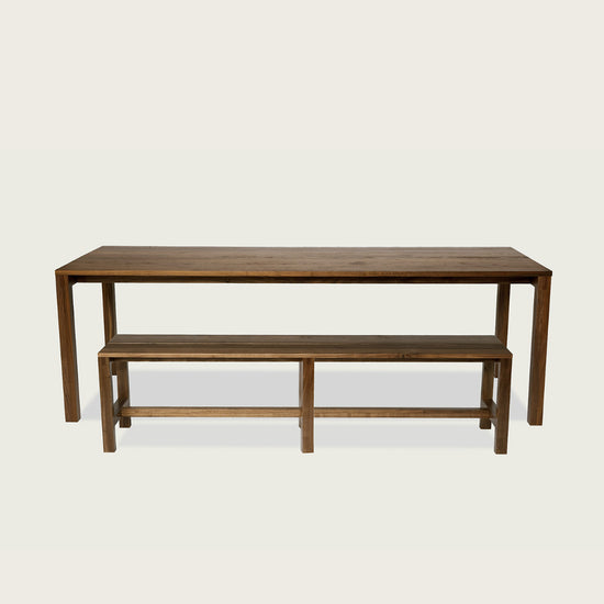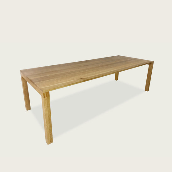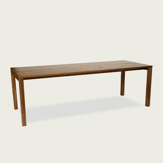 This refined Parsons table has a solid wood top, fashioned from narrow strips of timber, resting on square, solid wood legs. Quinn's inset long rails add to the lightness of the design. It can be paired with the complementary Quinn bench or one of our chairs for dining or use in a home office.