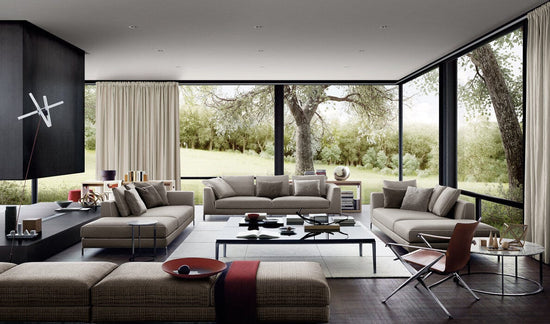 Aesthetical and functional, Ray is a modular system that starts with linear elements, chaise longues and terminal elements, which can be used to form all sorts of configurations – even corner and peninsula models. Its strong points are linearity and simplicity, enriched with tailoring elements such as the blanket stitch in the same colour or a contrasting hue, that enhances the removable covers. A main feature is the die-cast U-shaped foot that, along with the seat cushion height, contributes to creating an image of Ray as a particularly elegant piece with balanced forms.