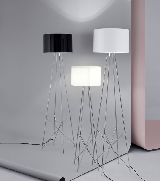 The Ray F is available in two models with diffusers available in black or white aluminum, or grey glass. It emits a gorgeous, diffused light. With the black and white finish, diffusers are lathe-shaped aluminum and painted white on the inside. The grey glass diffuser is hand-blown, overlaid glass with a glossy external finish.