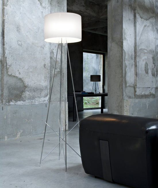 The Ray F floor lamp updates a classic shape to give it a decidedly contemporary edge. The steel tube structure of this modern floor lamp is welded, brushed, and chrome-plated, and its diffuser support disk is die-cast, polished, and chrome-plated with Zamak alloy. The lamp has a resistive dimmer wired on the cord, offering a 0-100% lighting adjustment. The power cord is a black PVC/PVC (flat) sheath.