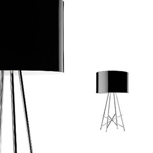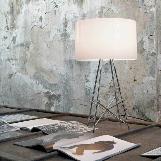 Designed by Rodolfo Dordoni in 2006, the Ray T table lamp updates a classic shape to give it a decidedly contemporary edge. The steel tube structure of this modern design is welded, brushed, and chrome-plated, and its diffuser support disk is die-cast, polished, and chrome-plated with Zamak alloy. Its lathe-shaped aluminum diffusers, painted white on the inside, are shiny white or black on the outside. Or, choose a grey colored, blown and overlaid glass diffuser with a glossy external finish. The lamp has a resistive dimmer wired on the cord, offering a 0-100% lighting adjustment. The power cord is a black PVC/PVC (flat) sheath.