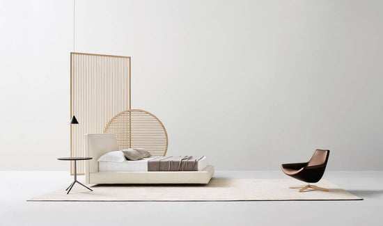 The Richard bed is available in different sizes, upholstered either in fabric or in leather. The design is defined by high sides running along the perimeter and by the sartorial detail of the seams with the insertion of a prominent profile. The height of the lateral bed sides makes it possible to use any type of mattress support, from traditional fixed ones to those with a manual headboard and footboard mechanism.