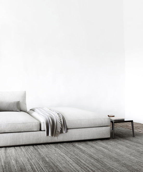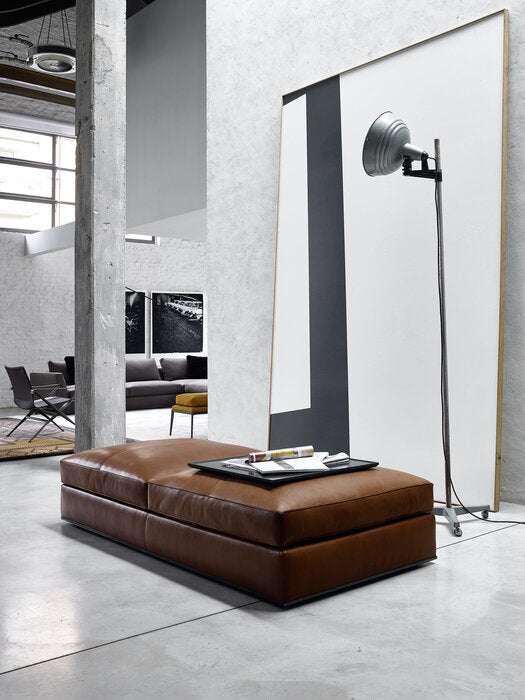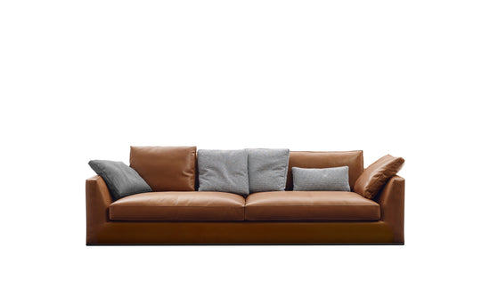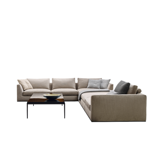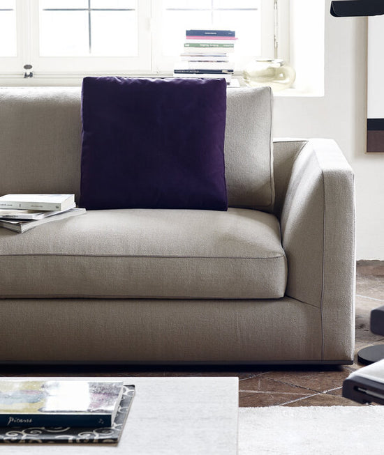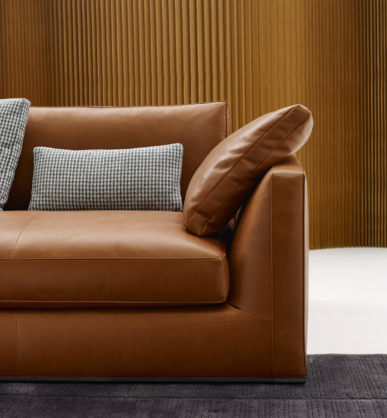 The system’s extreme flexibility and the ease with which the different elements can be assembled allows the living space to be interpreted in the most varied configurations, from formal to more relaxed, with seats, benches, ottomans and chaise longues. The wide range of covers, in fabric with matching tone-on-tone or contrasting textile profiles, or in leather with profiles in the same material, allows for even greater customization, offering monochromatic or contrasting solutions. The frame is underscored at the base by a metal profile. Optional cushions in various sizes add to the overall comfort.