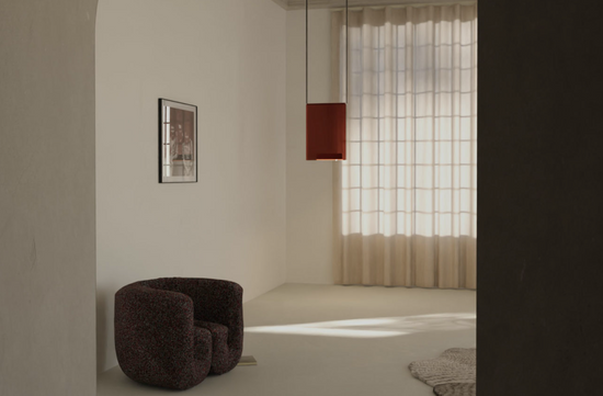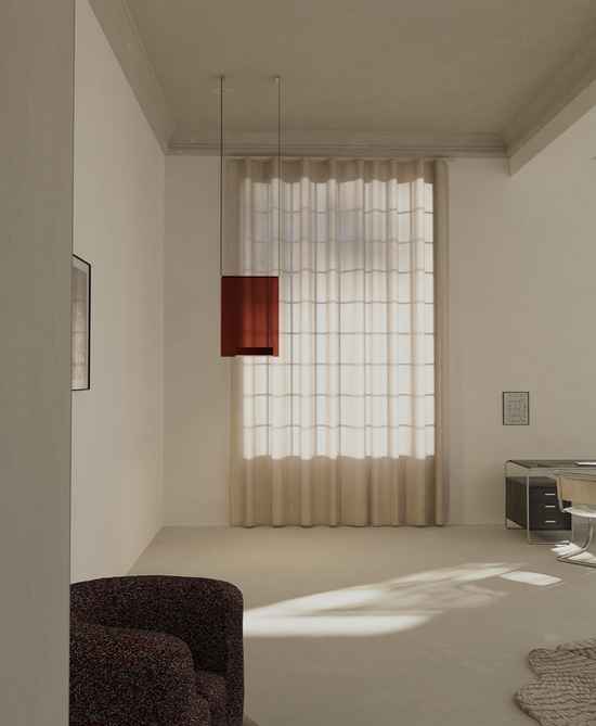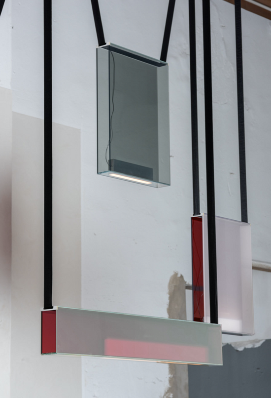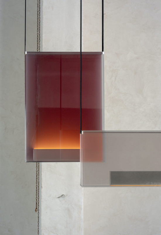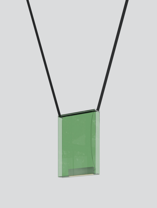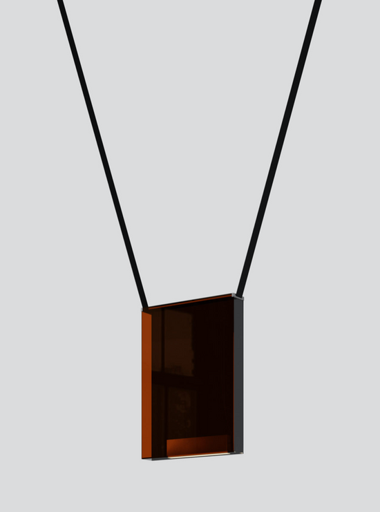 Sainte’s Atelier Series is scaled for large spaces and high ceilings—composed of boldly hued laminated glass panels with pronounced presence and weight. The dynamic colour options for this series harken a sense of majesty: lighting that creates a spectacle. A removable aluminum lightbox rests within the transparent glass and can be flipped around, allowing to cast light up or down. Created in collaboration with Canadian designer Rachel Bussin.