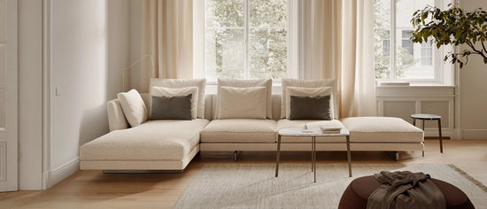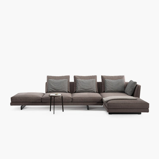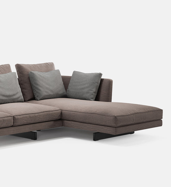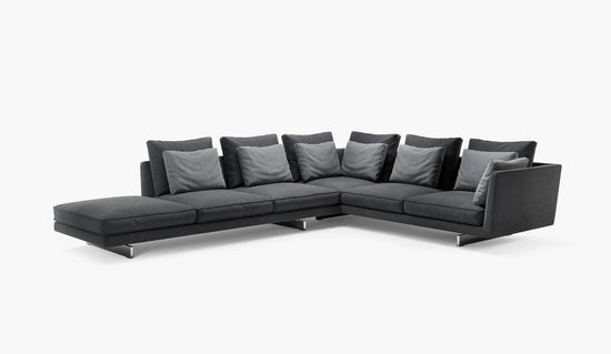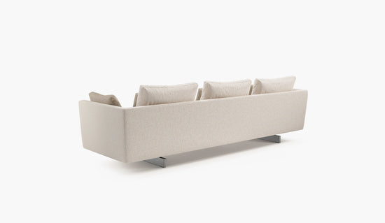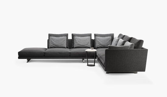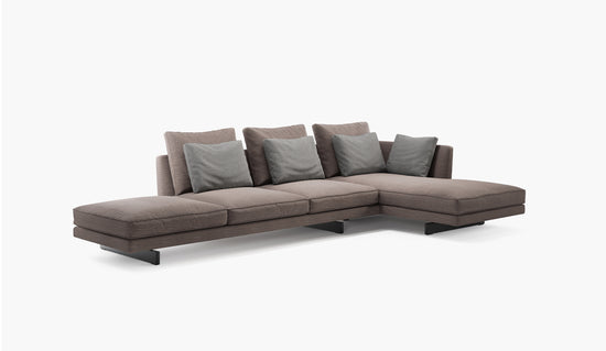 Resting atop parallel slim legs, the tapered backrest supports a plethora of feather cushions that invite you to lounge. Quality and comfort are top priority and may be readily experienced in the expansive modular series.