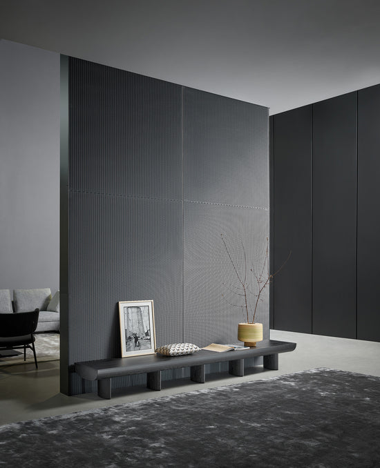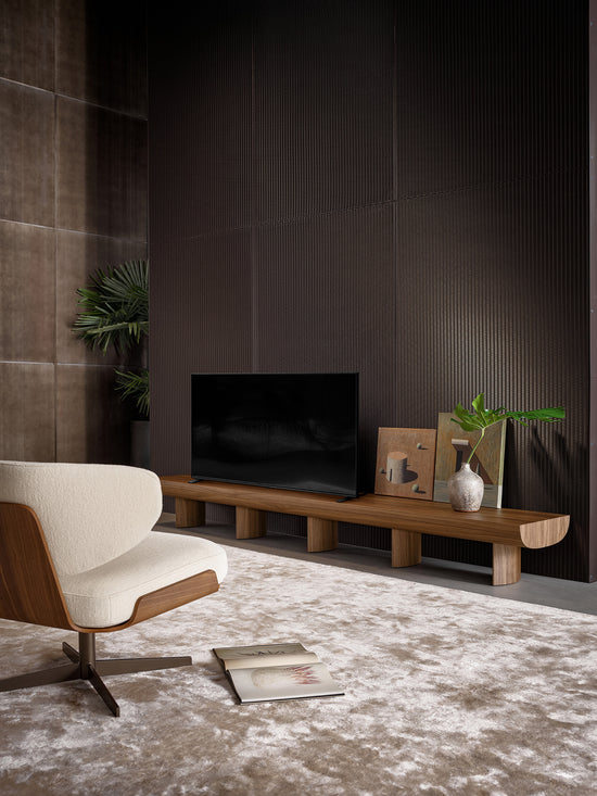 Designed by Alain Gilles, this TV stand is a piece with considerable impact even though it has a simple and linear design. Sculptural appears as a single wooden element supported by five legs which form the base. The surface develops in a downward arc while it has a cavity in the rear which is useful for concealing cables, thereby ensuring the maximum in aesthetic performance. Whether used as a TV stand or a design TV console, placed against a wall under the TV or in the living room in front of a sofa, Sculptural genuinely resembles a sculpture and this is the true stylistic hallmark of this design.