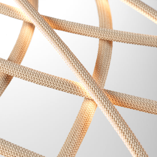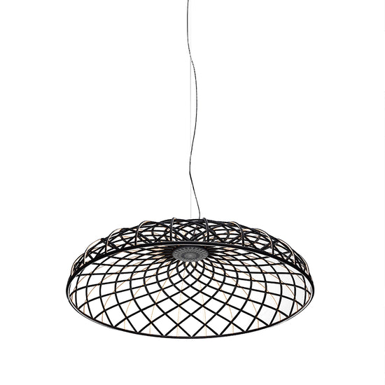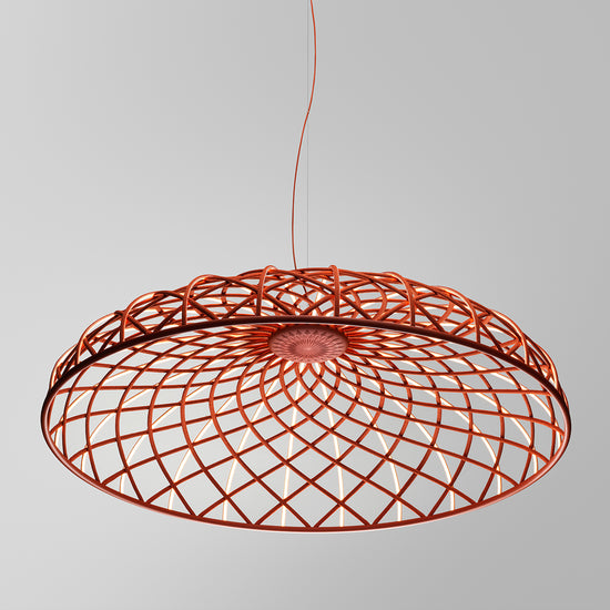 Diffuse pendant light fixture: a combination of luminous and dark elements arranged into a network and formed of core structures covered with a thin interwoven colorful tubular mesh made from recycled and recyclable fabric produced from polyester. Every single luminous element is powered by special micro-connectors located at the top of the dome and is covered with a two-tone mesh, while the side facing the inside of the dome is always white in order to allow for optimal light emission from the LED module.
