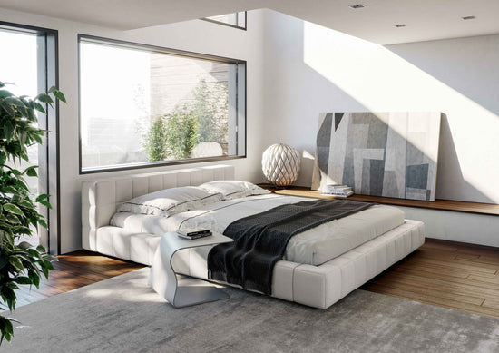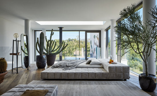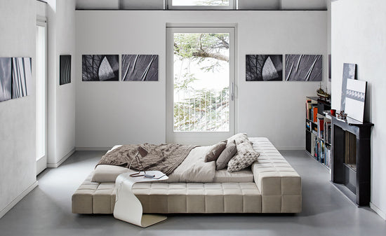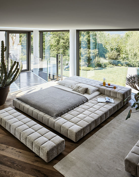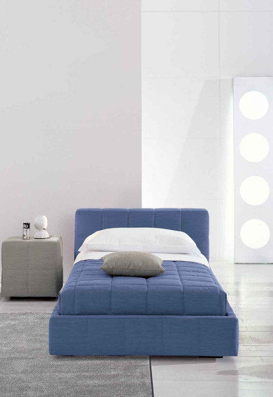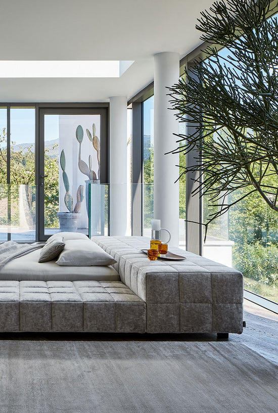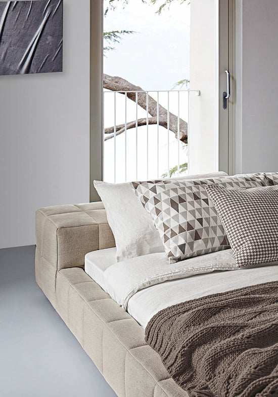 Available in the single or double bed version, it can be teamed with a wide range of accessories and it is available in various shapes: Squaring dormeuse, Squaring basso, Squaring alto, Squaring isola, Squaring isola alta, Squaring penisola. The fully removable upholstery covers are available in fabric, eco-leather or leather. The feet are made of anthracite grey-painted or, upon request, dark brown-painted wood.
