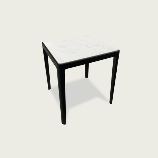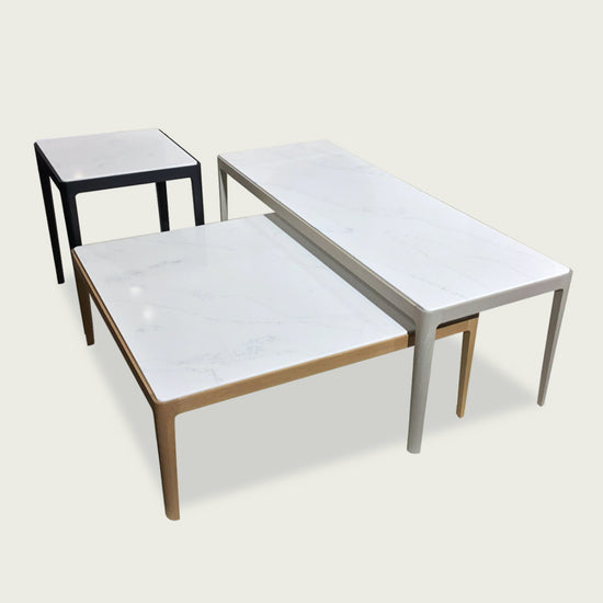 The Stadia table design has a sleek solid wood base that delicately frames the tabletop. The gently tapering legs with their smoothly curved inside face, add to the overall lightness of the design. Choose between a carefully shaped quartz top or a complementary veneered top.