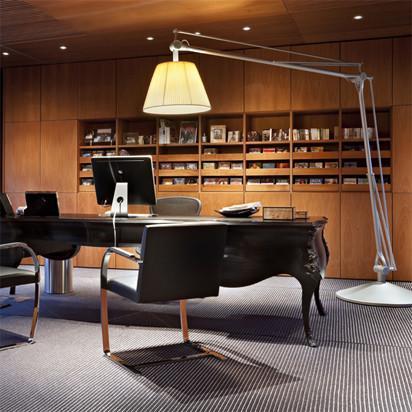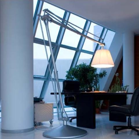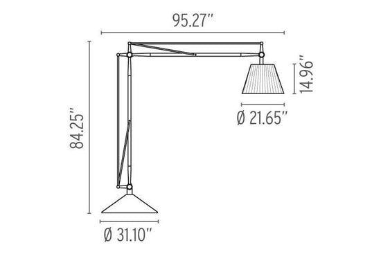 A brilliant play on perspective, Superarchimoon feels oversized and magnificent, providing direct and diffused light via a pleated cloth external diffuser and acid-etched, hand-blown glass internal diffuser. The diffuser support is sandcast aluminum, and the gray-painted assembly is composed of tubular aluminum arms and tie rods, a stainless steel spring, and die-cast aluminum joints. The sand-cast aluminum base features six lead counterweights and a painted gray spun-aluminum base cover.