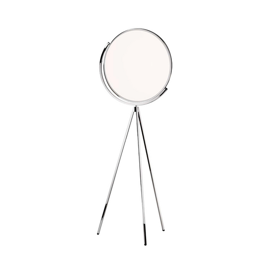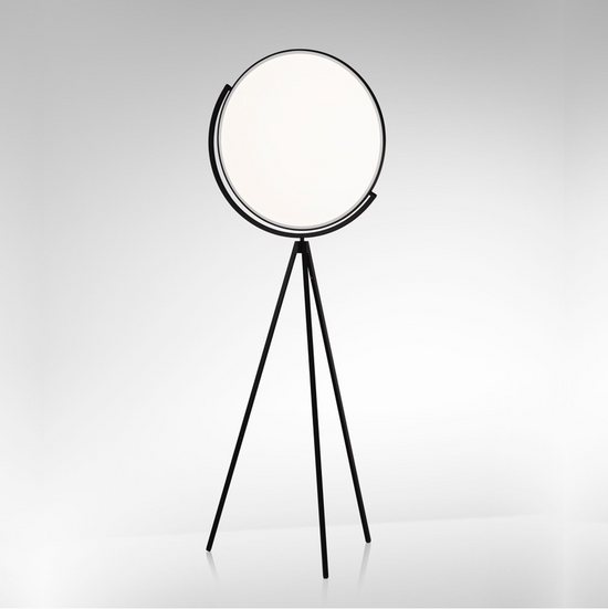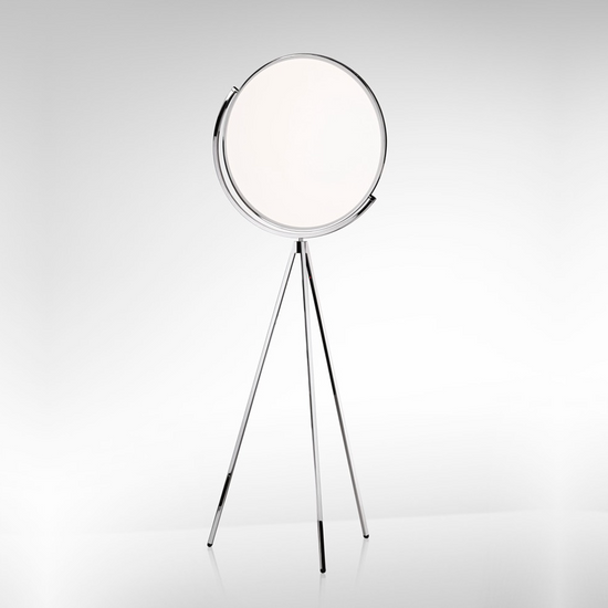 The Superloon provides direct light. Its painted or chrome-plated aluminum body features a metal spinning head, die-cast joints, and an extruded stem. The diffuser is silk-screened PMMA (Polymethyl methacrylate). The light source is Edge Lighting, and there is an optical switch sensor on the stem that enables the warm tone dimming function. The stem includes the Soft Touch sensor, which guarantees a fluid and precise control of light flow with a simple and natural touch of the hand. The power cord is 250 centimeters long. There is a plug-in power supply with interchangeable plugs.