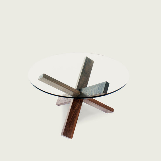 Inspired by the joinery of a traditional Japanese three-dimensional puzzle, the solid wood legs of this intriguing glass-topped coffee table slide together smoothly and lock firmly in place without mechanical fasteners.
